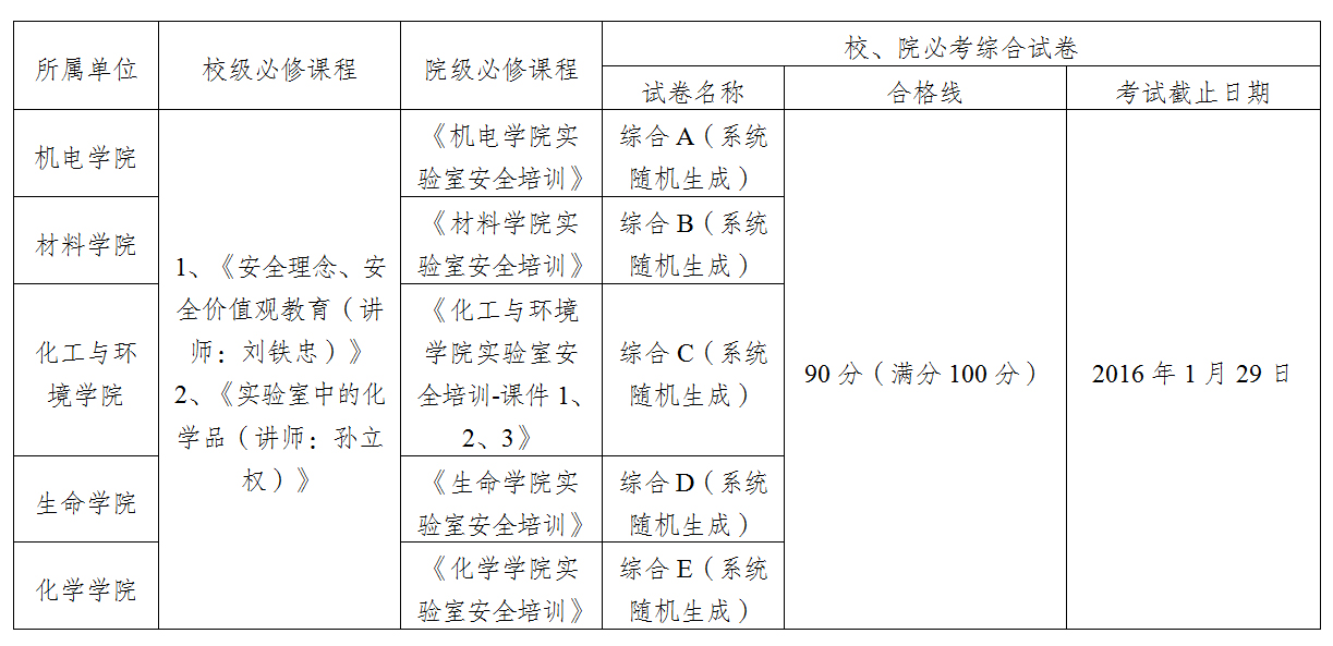 表1 学校和学院实验室安全培训课程和考试安排表