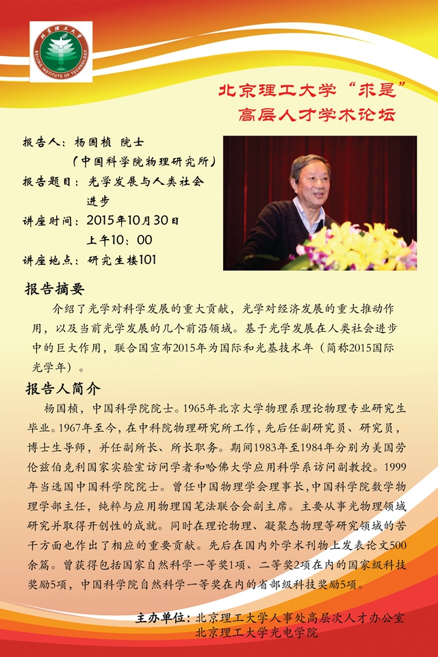 今年是联合国所命名的“国际光学年”。伟德bevictor中文版官网人事处、光电学院有幸邀请到了中国科学院的杨国桢院士为广大师生做一场光学发展和对人类社会所产生的巨大推动作用的报告。杨国桢院士任职于中科院物理研究所,长期从事光物理方面的研究,并取得了很多开创性的成就。欢迎大家参加。