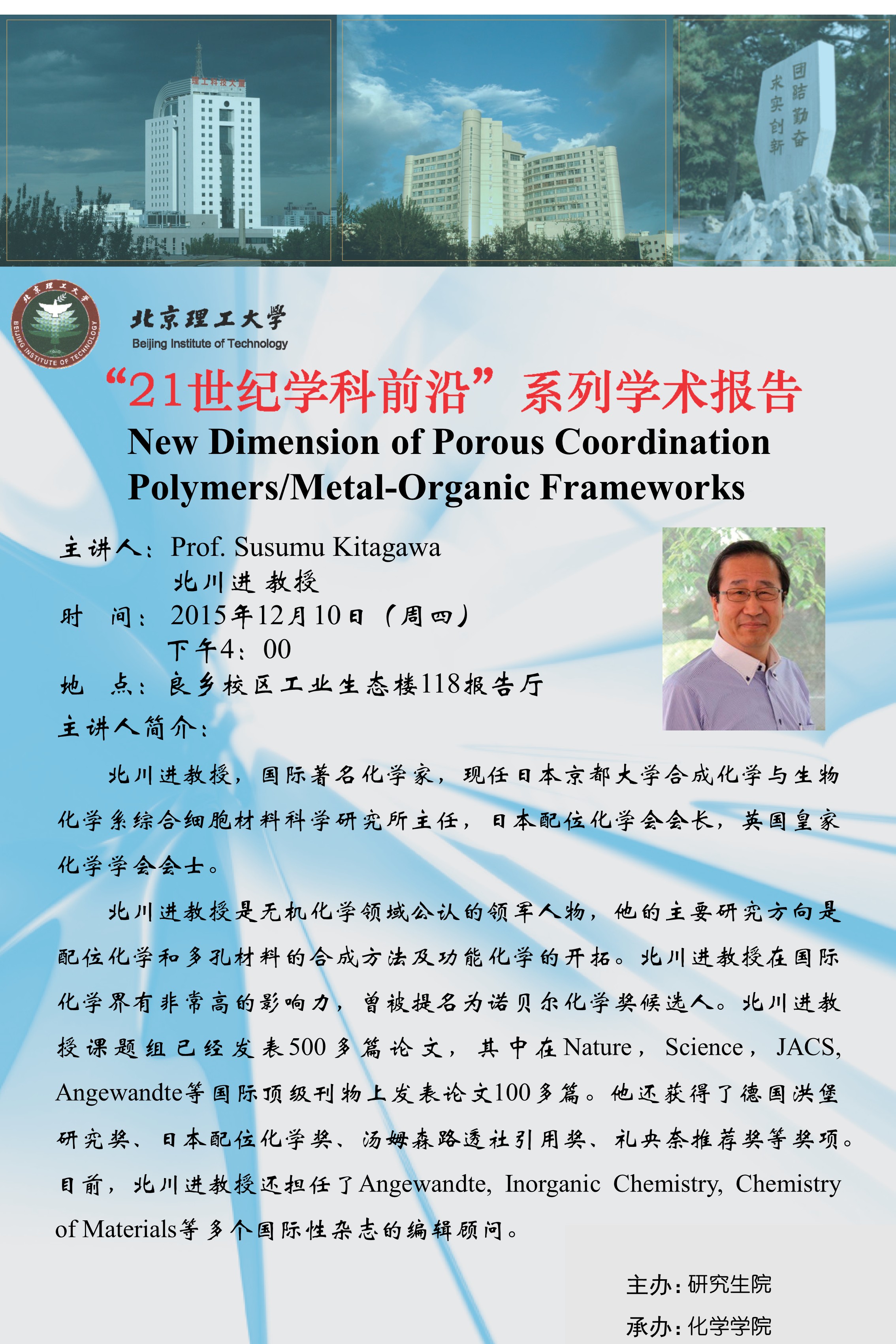 > 【化学学院】“21世纪学科前沿”北川进教授学术报告通知