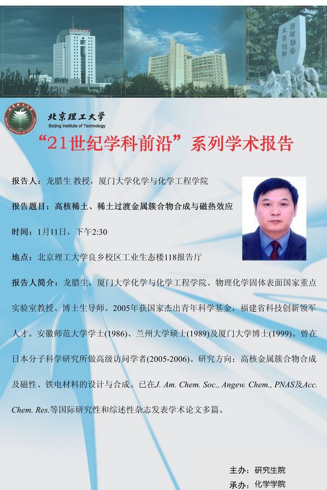 > 【化学学院】“21世纪学科前沿”龙腊生教授学术报告通知