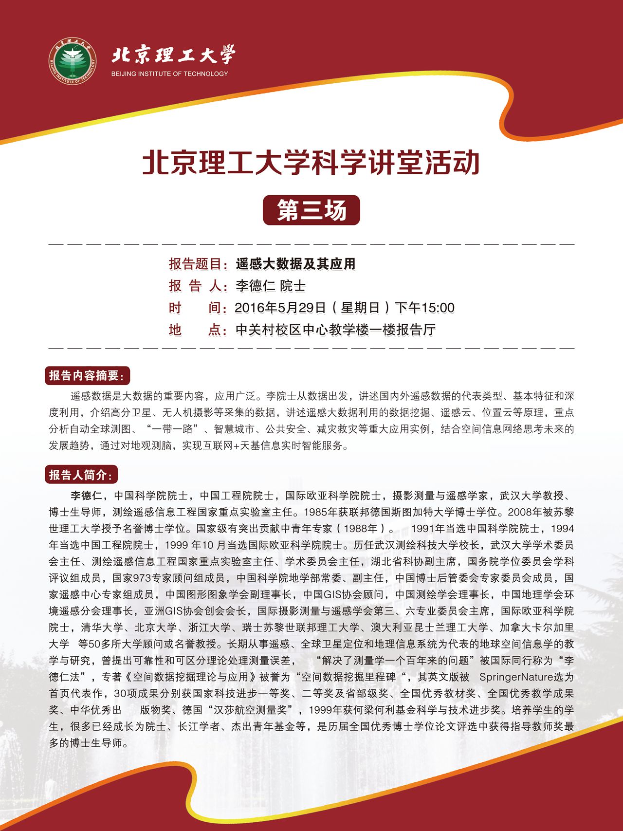 我校邀请了中国科学院、中国工程院、国际欧亚科学院李德仁院士于5月29日(本周日)下午来校做遥感大数据及其应用的学术报告,欢迎感兴趣的老师及同学参加本次科学讲堂活动。