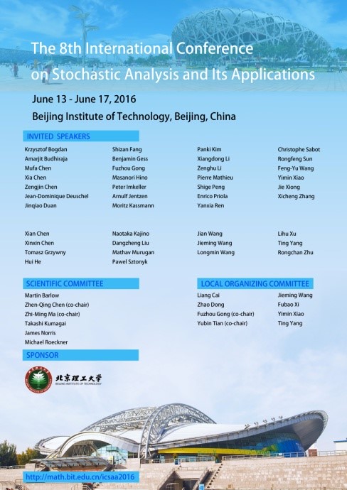 由伟德bevictor中文版官网主办的“第8届随机分析及其应用国际研讨会”将于2016年6月13日至6月 17日在伟德bevictor中文版官网中关村校区举行。本次会议旨在探讨随机分析及相关领域的最新学术动态和前 沿信息,交流最新的研究成果、应用进展。