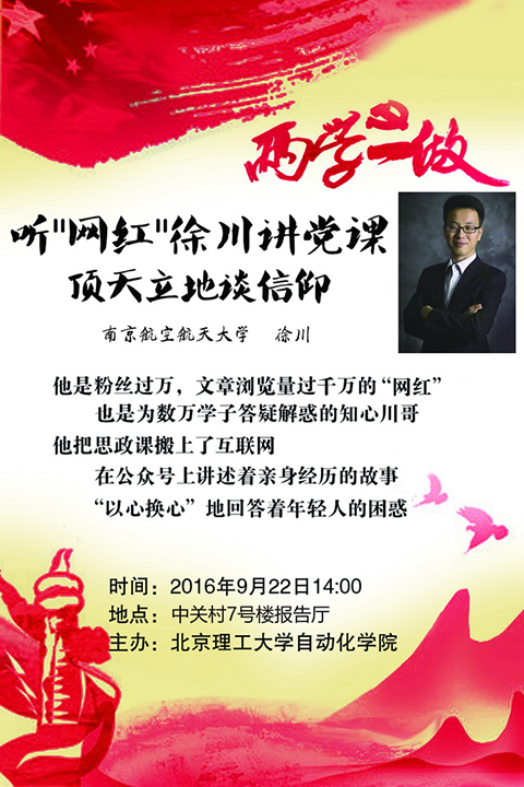 《一二九里谈青年》、《教师节里谈教育》、《青年节里谈中国》等系列文章形成节日期待,浏览量达到一千多万;“全国百名网络正能量榜样”如火如荼,选票达到三百三十多万;《为了不能忘却的纪念》等文章进入“全国百篇正能量文章”评选,点赞接近二十万;“南航徐川”微信公众号开通一年,回答学生提问十万余条;走遍全国百所高校,面授学生超过二十万;参与发起“高校辅导员新媒体联盟”,在全国高校辅导员队伍建设微信传播指数原创排行榜中高居榜首;《中国传统文化概论》选课开通三秒钟,选课名额一抢而空……