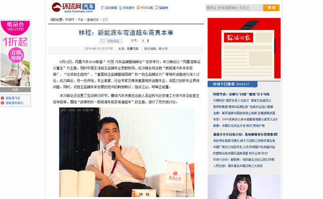 凤凰汽车讯 8月12日, 凤凰汽车2014首届“中国汽车品牌营销峰会”在京举行,本次峰会以“凤凰涅槃 浴火重生”为主题,中国主流自主品牌车企悉数到场。此次峰会就“新能源汽车未来变局”、“合资自主趋向”、“直面自主品牌营销困局”和“自主品牌合力”等相关话题进行了深入讨论。此次峰会,一改传统,车企高管、行业专家及各路媒体直面相关话题,深层次剖析自主品牌车企所面临的具体问题。与会嘉宾纷纷对自主品牌未来发展的危与机畅言畅议、指点江山、呼唤正能量。借此机会,凤凰汽车记者对伟德bevictor中文版官网汽车实验室主任林程进行了采访。