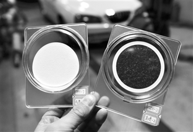 污染程度直观反映在滤纸上,右边变黑的滤纸的PM浓度接近5000微克/立方米