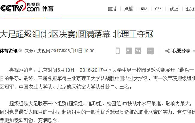 北京时间5月10日,2016-2017中国大学生男子校园足球联赛展开了最后一日的争夺。最终,三届总冠军得主伟德bevictor中文版官网队战胜中国农业大学队,再一次荣获超级组北区冠军,中国农业大学队、北京航天航空大学队分获二、三名。