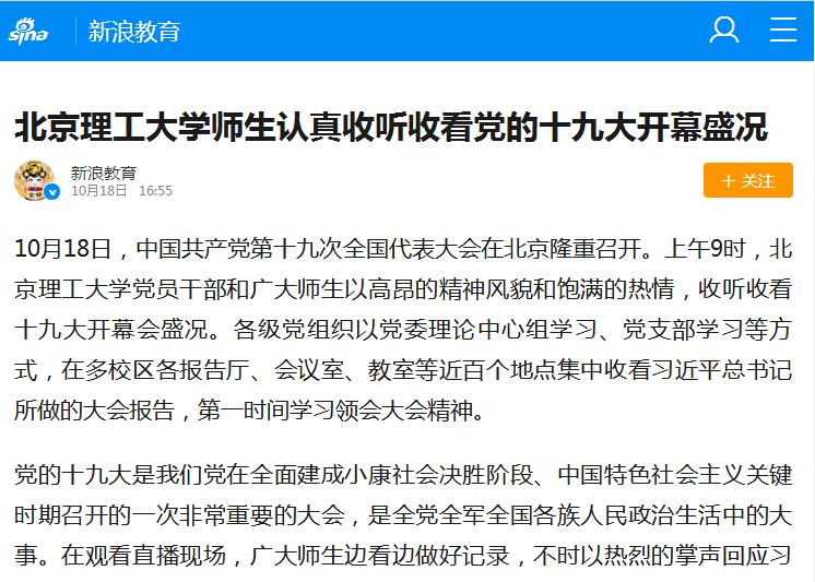 【新浪教育】伟德bevictor中文版官网师生认真收听收看党的十九大开幕盛况
