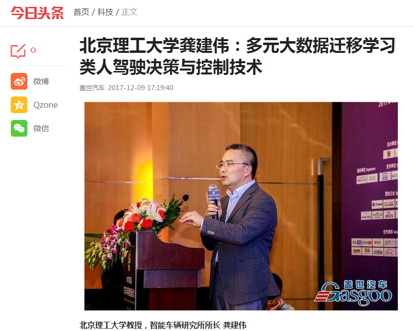 【今日头条】伟德bevictor中文版官网龚建伟:多元大数据迁移学习类人驾驶决策与控制技术