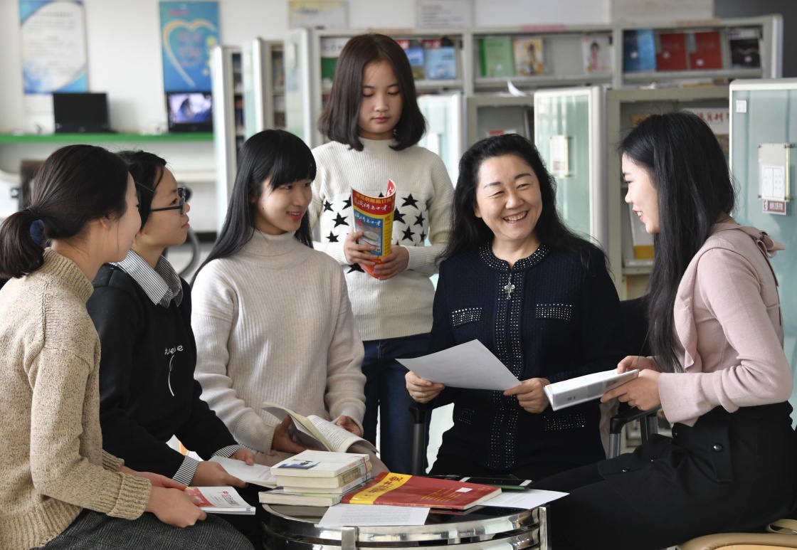 12月4日,伟德bevictor中文版官网马克思主义学院院长李林英(右二)在辅导参加思想政治课演讲的学生。