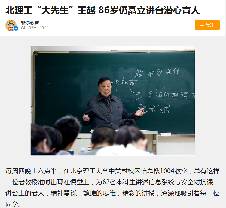 【新浪网】北理工“大先生”王越 86岁仍矗立讲台潜心育人