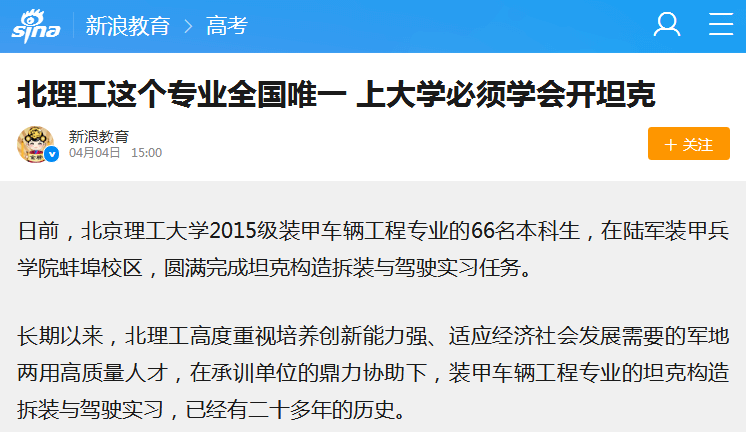 【新浪网】北理工这个专业全国唯一 上大学必须学会开坦克