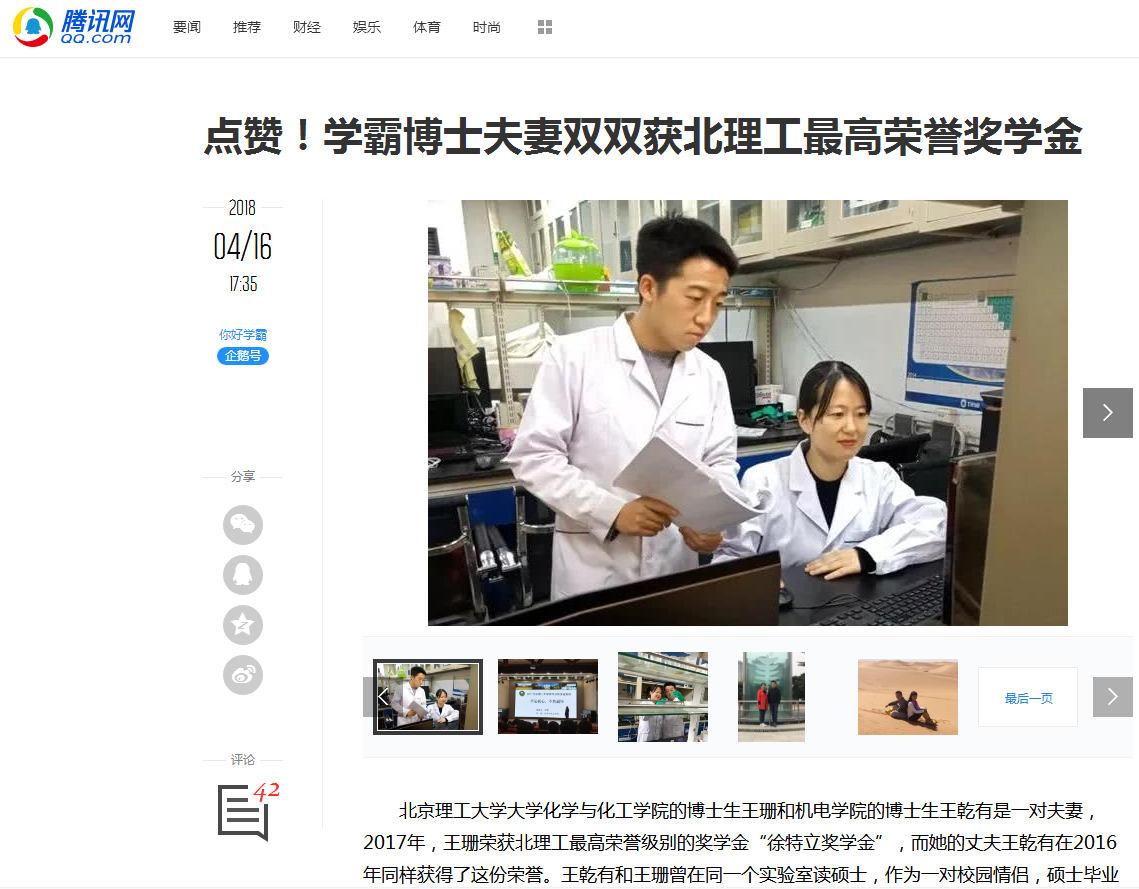【腾讯网】博士夫妻双获北理工最高荣誉奖学金