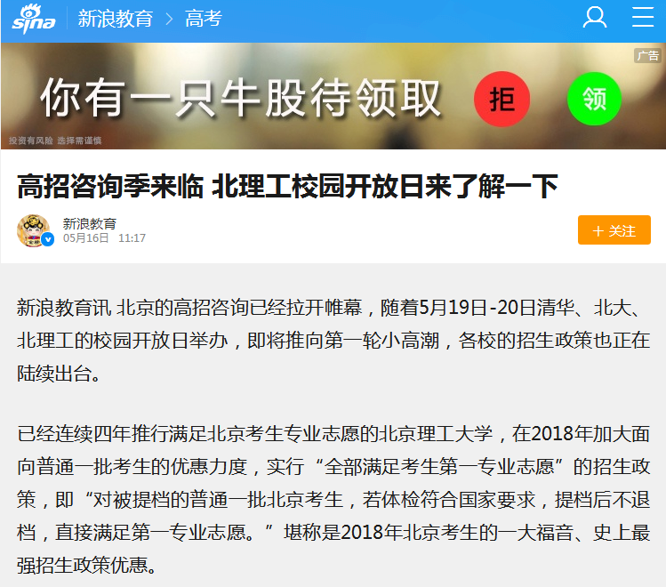 【新浪网】高招咨询季来临 北理工校园开放日来了解一下