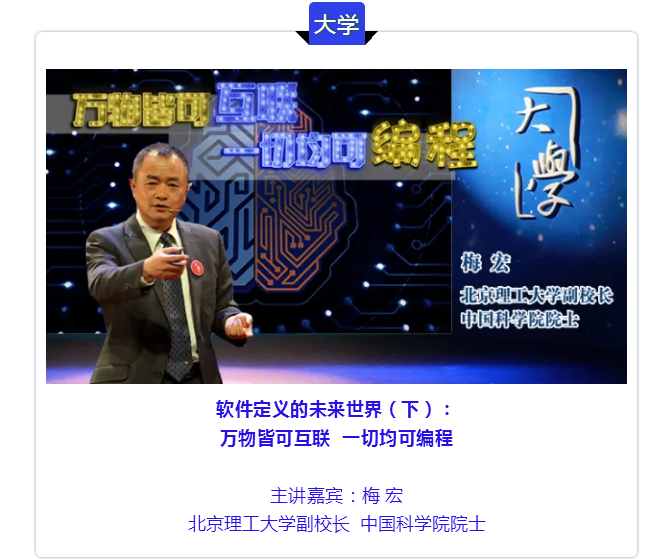 梅宏:同学们好,欢迎来到《大学》。今天我就想和大家聊一聊我自己的专业——软件。