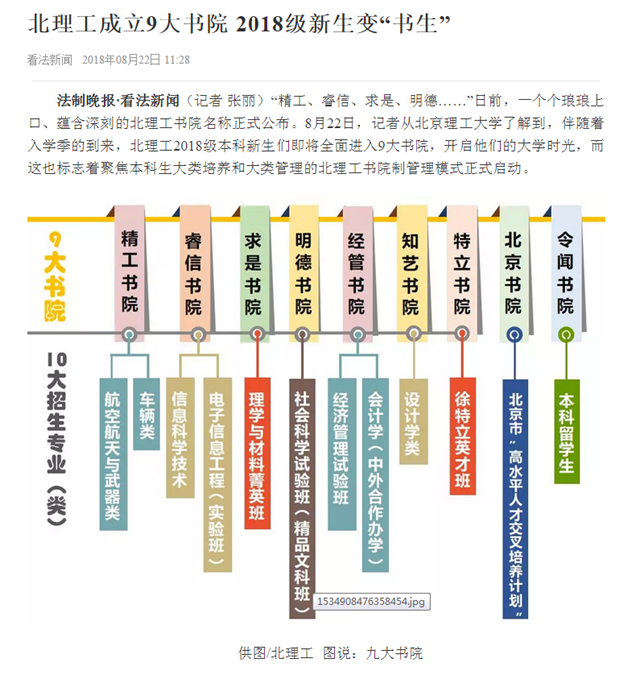 【法制晚报·看法新闻】北理工成立9大书院 2018级新生变“书生”