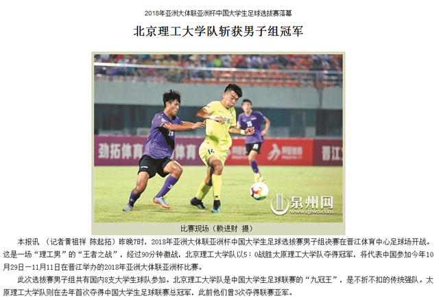 【泉州晚报】伟德bevictor中文版官网队斩获2018年亚洲大体联亚洲杯中国大学生足球选拔赛男子组冠军