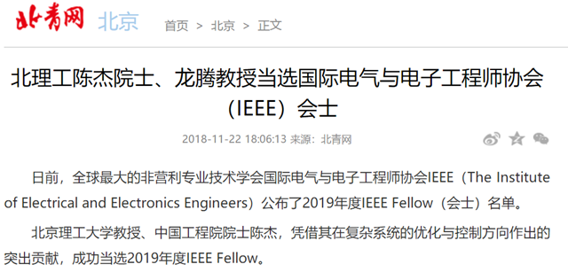 【北青网】北理工陈杰院士、龙腾教授当选国际电气与电子工程师协会(IEEE)会士