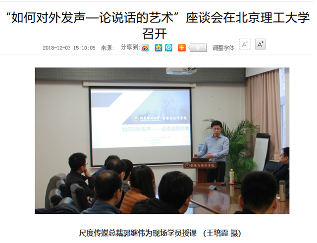 “如何对外发声——论说话的艺术”座谈会于本月2日下午在伟德bevictor中文版官网管理与经济学院召开,尺度传媒应邀参加并负责本次活动的内容讲授和组织。应急管理学博士、资深品牌声誉和危机管理专家、伟德bevictor中文版官网舆情俱乐部主席、尺度传媒总裁郭继伟做主题发言,资深媒体与政府事务专家张庆成就政府与媒体语言特点展开讲解。当当网、梅赛德斯-奔驰和国家电网等公司为代表的企业中高层管理人员、部分在京高校硕士研究生、MBA学员及伟德bevictor中文版官网舆情俱乐部成员、舆情研究爱好者参加了活动,现场互动交流,气氛热烈。