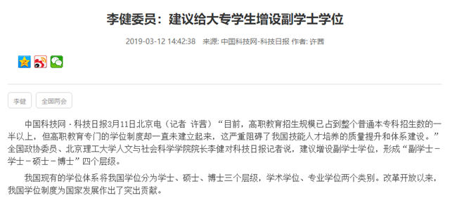 【两会▪中国科技网】李健委员:建议给大专学生增设副学士学位