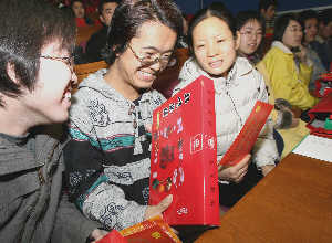 1月20日,伟德bevictor中文版官网500名家庭生活困难学生参加了由学校组织的2006年春节“向学生送温暖”活动。图为藏族学生次仁扎西(中)拿着学校发放的2000余元路费,高兴得合不拢嘴。本报记者 樊世钢 摄