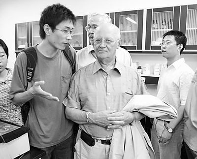 俄罗斯科学院院士马特韦延科·亚历山大·马卡罗维奇(前右)在理工大学学生的陪同下参观校园生命科学学院实验室。近日,中俄老中青科学家联谊活动——教育组研讨会在伟德bevictor中文版官网召开。