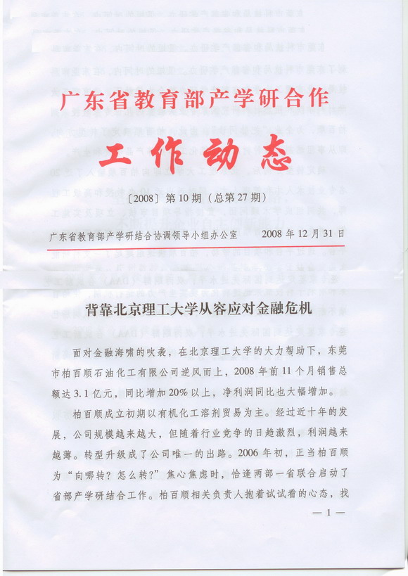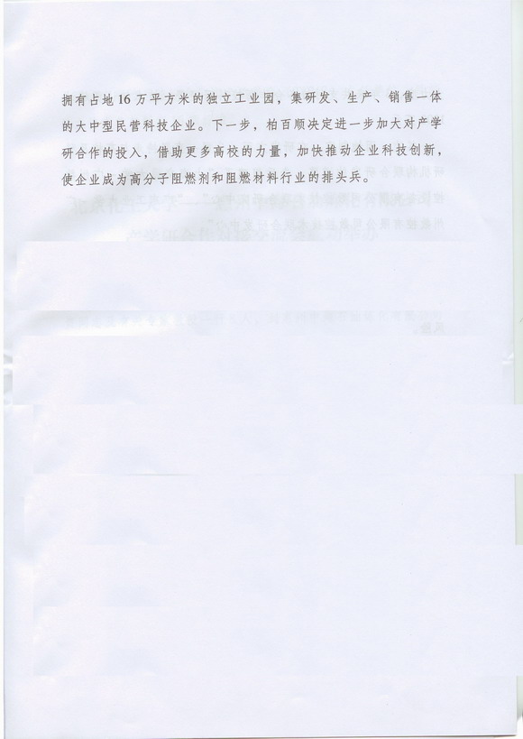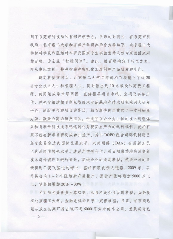 柏百顺成立初期以有机化工溶剂贸易为主。经过近十年的发展,公司规模越来越大,但随着行业竞争的日趋激烈,利润越来越薄。转型升级成了公司唯一的出路。2006年初,正当柏百顺为“向哪转?怎么转?”焦心焦虑时,恰逢两部一省联合启动了省部产学研结合工作。柏百顺相关负责人抱着试试看的心态,找到了东莞市科技局和省部产学研办。很短的时间内,在东莞市科技局、伟德bevictor中文版官网和省部产学研办的合力推动下,伟德bevictor中文版官网材料学院和阻燃材料研究国家专业实验室的几位专家教授来到柏百顺,为企业“把脉问诊”。由此,柏百顺确定了转型方向,即从事阻燃剂、特种树脂和有机化工溶剂等产品研发和生产。
