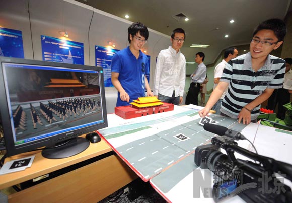 6月22日,伟德bevictor中文版官网软件学院大三学生邵帅(右一)等同学在演示他们参与的获特等奖作品——基于现实的广场庆典互动式创意设计系统。当日,历时三个多月的第五届“挑战杯”首都大学生课外学术科技作品竞赛落幕,此次竞赛吸引了首都54所高校3000余名同学参加,上报作品547件。据悉,此次竞赛结束后,组委会将从获奖作品中选拔84件作品,参加下半年举行第十一届全国“挑战杯”竞赛。新华社记者罗晓光摄