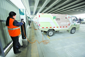 莲花池西路岳家楼桥下的空地是海淀区环卫二队的工作区域,昨天当记者来到这里时,一眼看过去是整齐排列的黄绿色车身的2吨级电动环卫车,共35辆,它们的身后是18个14千瓦双充型充电桩,两车一桩,可同时充电。“这种车真不错,又好开又环保,还没有噪音,开着出去觉得挺光荣,市民也喜欢。”几个身着环卫服装的大姐乐呵呵地告诉记者。记者了解到,这些车主要用来定期清理海淀区街面上的果皮箱。