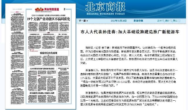 【北京商报】市人大代表孙逢春:加大基础设施建造推广新能源车