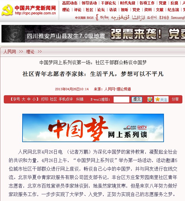 为深化中国梦的宣传教育,凝聚起全社会的共识和力量,4月26日上午,“中国梦网上系列谈”举办第一场活动,活动邀请5位城市社区干部群众进行网上座谈,畅谈自己心中的中国梦,并与网友进行在线交流。北京华夏中青家政服务有限公司团支部书记,丰台区方庄紫芳园南里社区青年志愿者,北京市百姓宣讲员李家妹谈到,她虽然家境贫寒,但是来京八年努力做好家政服务工作,一步步实现了大学梦、入党梦,正努力实现自己的志愿服务之梦。