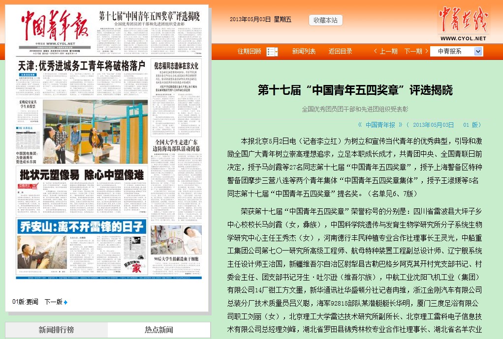 【中国青年报】北理工刘峰获第十七届"中国青年五四奖章"