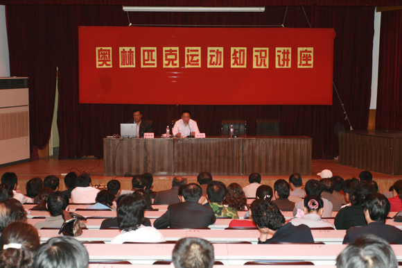 王皋华教授从中国北京举办奥运会的重要意义,到古代雅典运动会的起源、现代奥运会的发展,用生动的语言、珍贵的图片,讲述了奥林匹克运动知识,让我们在了解奥运的同时,了解了中国由弱到强的历史,油然而生出一股强烈的民族自豪感和光荣使命感。让我们每一位中国人感到2008年奥运会即是历史赋予我们的机遇,也是历史给予我们的挑战。从与会者聚精会神地眼神中我们似乎看到了奥林匹克更快、更高、更强的精神已深入人心。