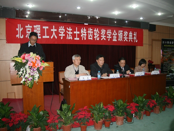 2009年3月30日下午,我校在中关村校区隆重举行首届法士特齿轮奖学金颁奖典礼。我校党委副书记侯光明、教务处副处长林海、学生工作部(处)副部(处)长杨海、机械与车辆学院分党委书记张英、机械与车辆学院分党委副书记兼副院长阎艳等领导同志出席了颁奖典礼。陕西法士特齿轮有限责任公司销售总部部长何志军、我校84级校友、陕西法士特齿轮有限责任公司齿轮研究所副所长程书辉等同志代表出资企业出席了颁奖典礼。颁奖典礼由机械与车辆学院研工委书记徐贵宝同志主持。