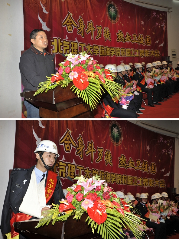 珠海学院院长、党委书记庞思勤教授颁布嘉奖令,先进个人代表保安员张旺发言
