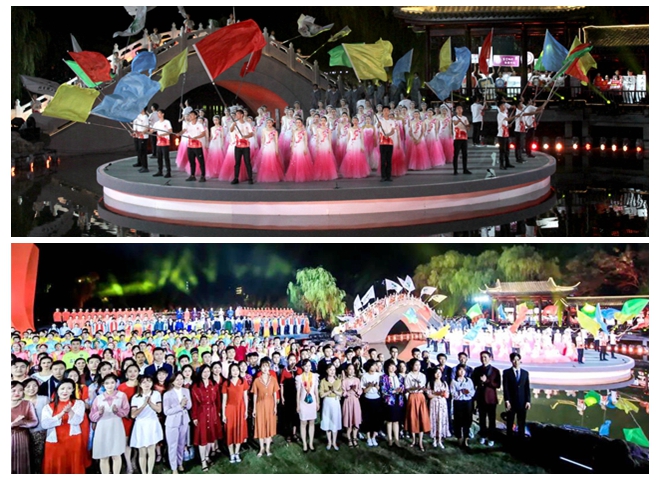 在绚烂多彩的屏幕缓缓降下时,尾声“创未来”从远处栈桥上北理工交响乐团的演奏中徐徐展开,环北湖灯光亮起,各学院、书院代表英姿飒爽手举院旗向观众席走来,八面伟德bevictor中文版官网校旗在众人簇拥下,飘扬在绚丽的舞台上。北湖畔的树林中、山坡上、拱桥边、廊亭下,数千名北理工师生伫立其间共唱校歌,将晚会推向高潮。在全体演职人员嘹亮的《歌唱祖国》声中,晚会圆满结束。